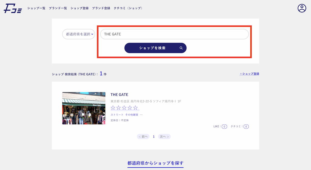 赤枠でショップを検索し、クチコミを投稿する店舗を選択