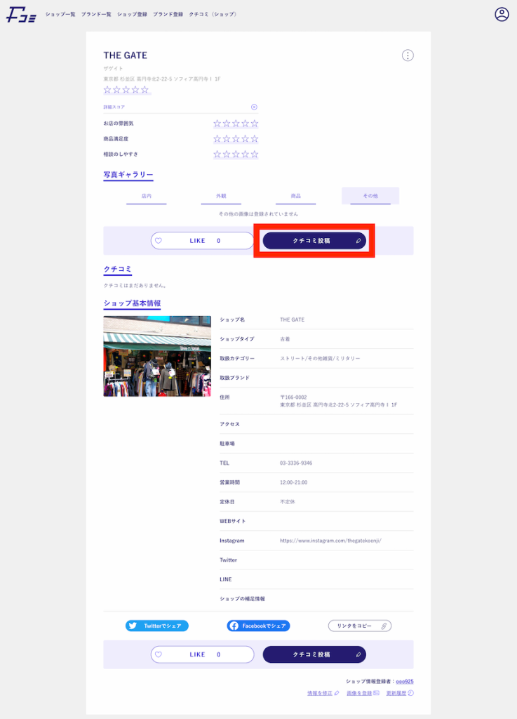 ショップ情報ページ赤枠の「クチコミ投稿」を選択