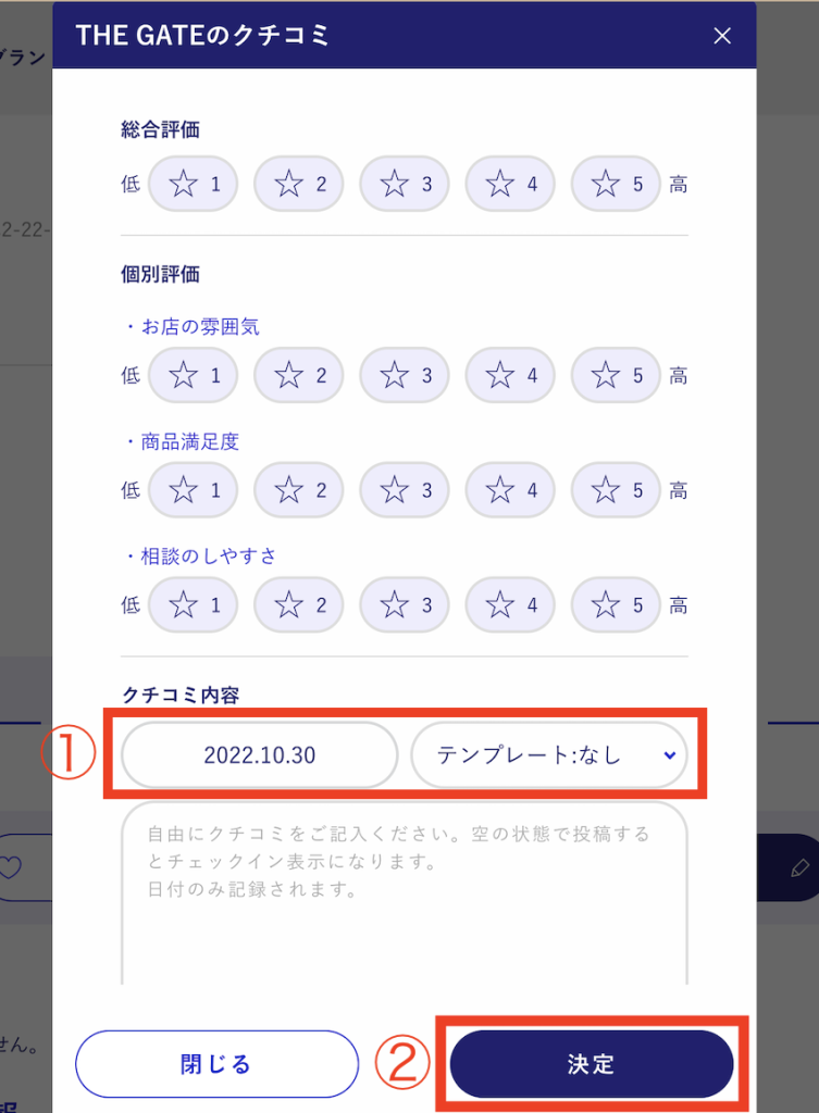 ①の赤枠に来店した日付、クチコミテンプレートを選択し、②の決定で投稿完了。