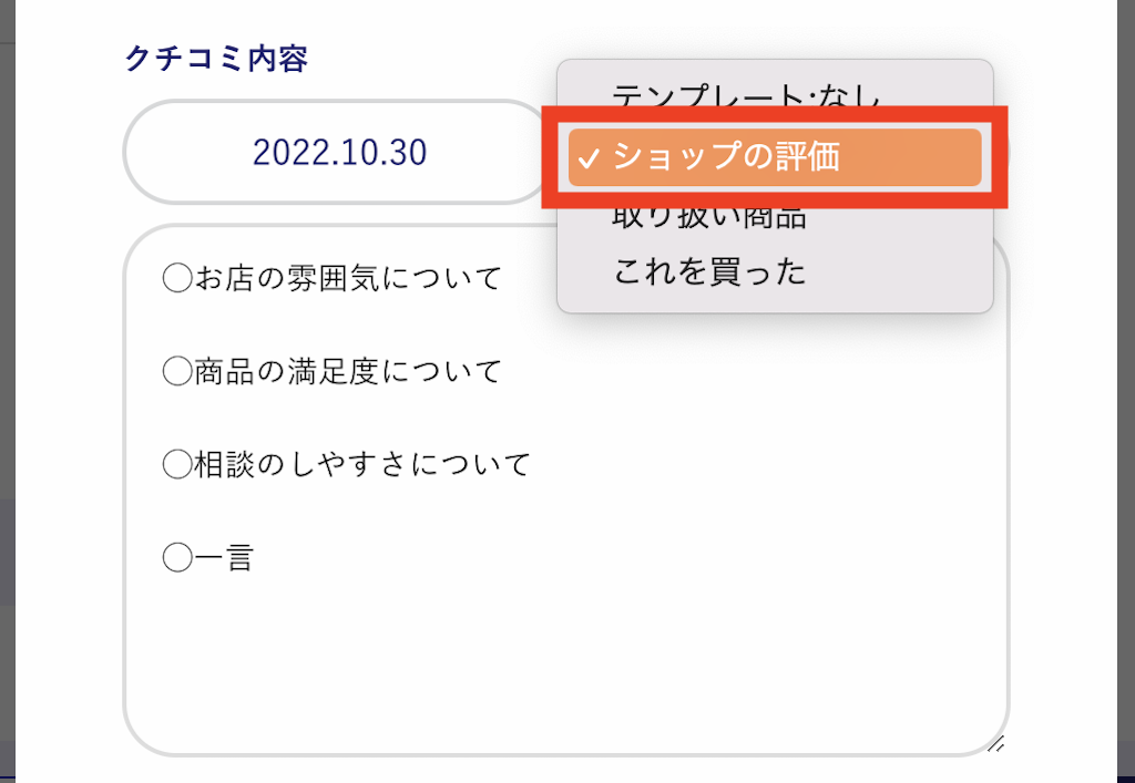①ショップの評価、②取り扱い商品、③これを買った、の中から選択し、記入する。